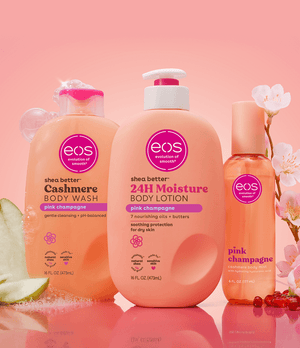 Three eos products including body wash, lotion, and serum on a light background
